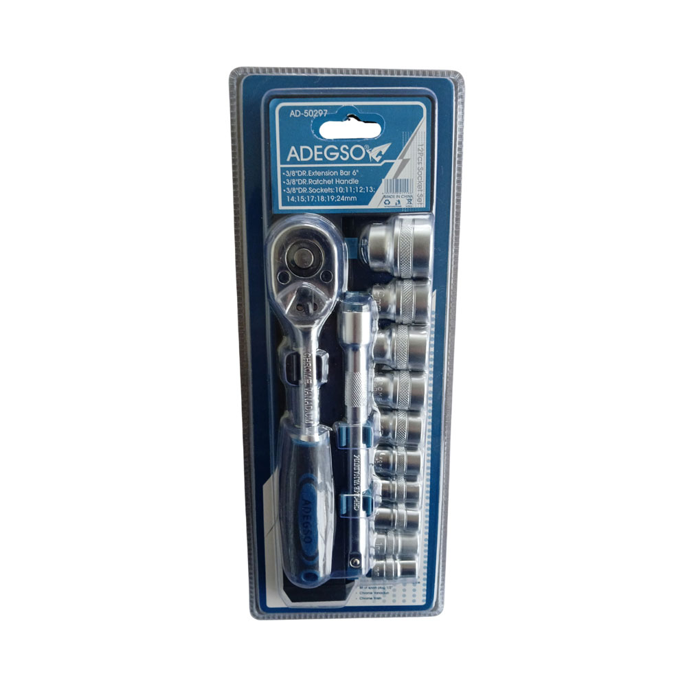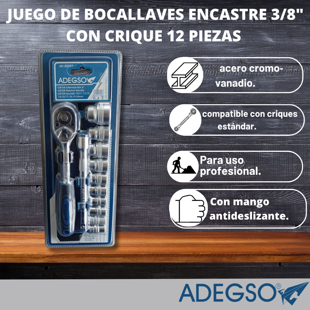 Descripción principal: Juego de bocallaves Encastre 3/8" con crique 12 Piezas (Extension 5", manija crique, tubos de 10, 11, 12, 13, 14, 15, 17,18,19, 24mm)