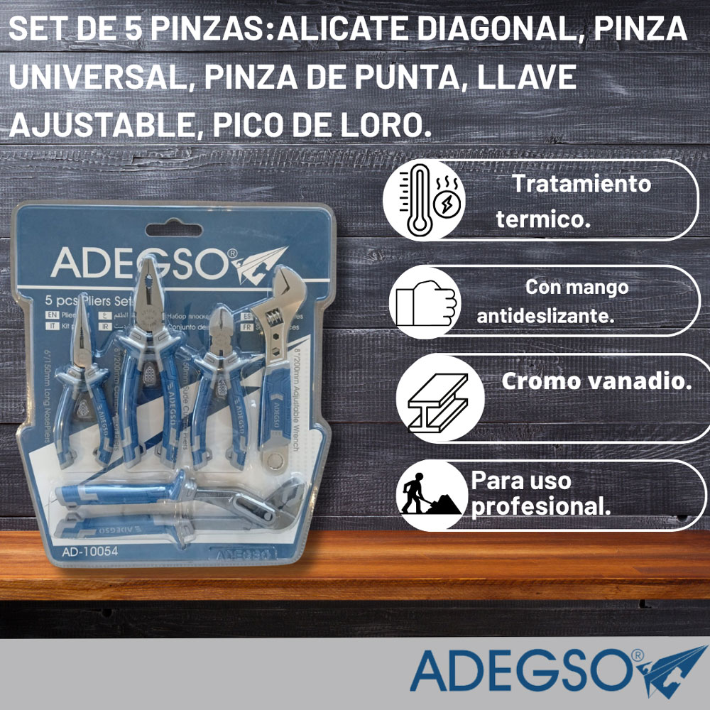 Descripción principal: Set de 5 pinzas: Alicate diagonal + Pinza universal + Pinza de punta + Llave ajustable + Pico de loro