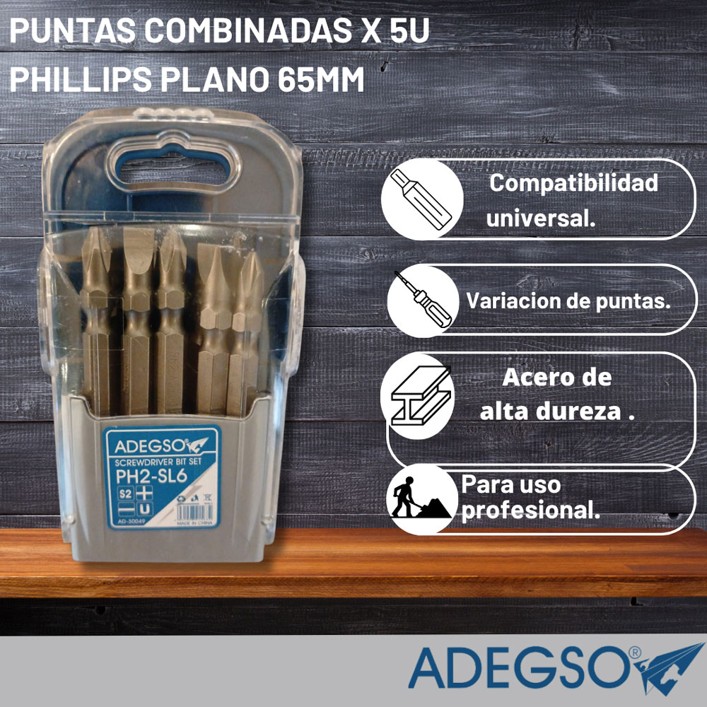 Descripción principal: Puntas Combinadas x 5U Phillips Plano 65mm